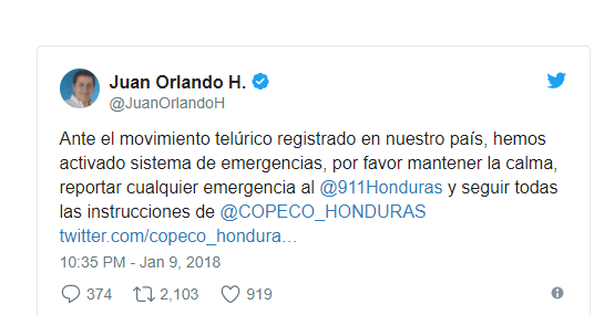 Honduran President Juan Orlando Hernandez said via Twitter in Spanish that Honduras had activated its emergency system and asked people to remain calm.