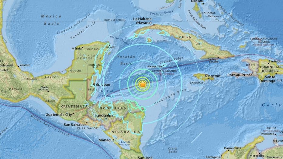 The U.S. Geological Survey said the quake, initially reported as a magnitude 7.8, was centered 125 miles (202 km) northeast of Barra Patuca in Honduras and 191 miles (307 km) southwest of George Town in the Cayman Islands.