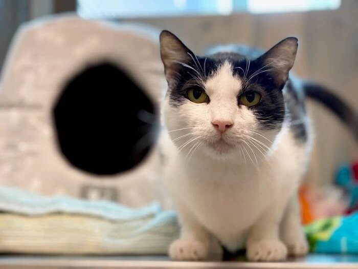 A 12-year-old male cat named Bam Bam is one of 38 animals brought to Massachusetts from St. Thomas.