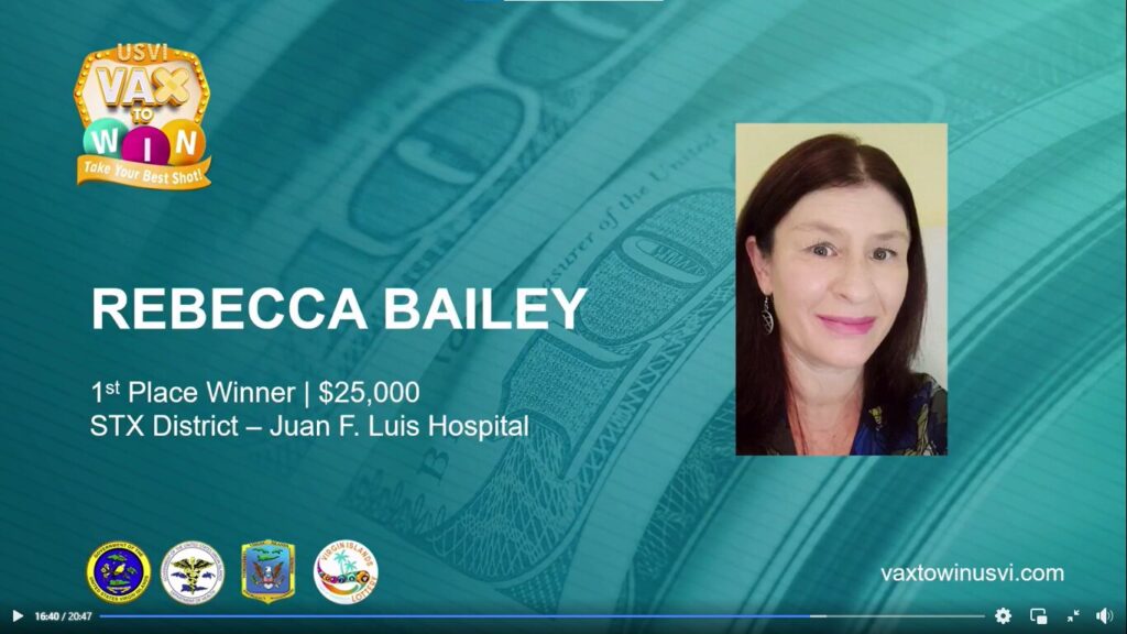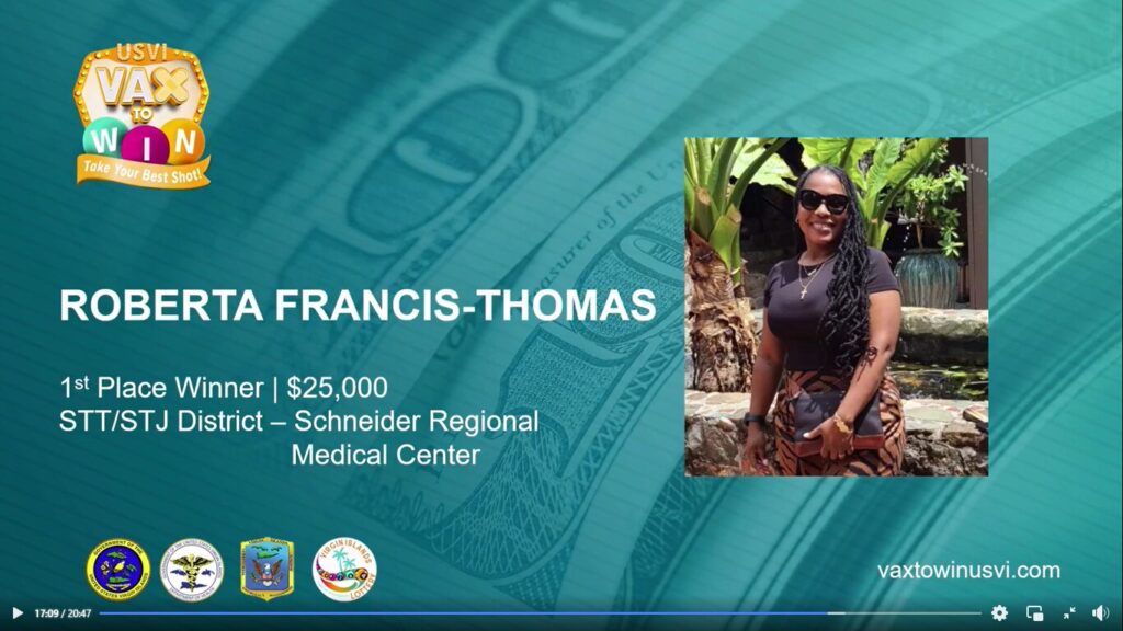 During today’s Government House weekly press briefing, Communications Director Richard Motta and Verita Carmichael, of the Virgin Islands Lottery, announced the winners of the special drawing for health care workers who are fully vaccinated.