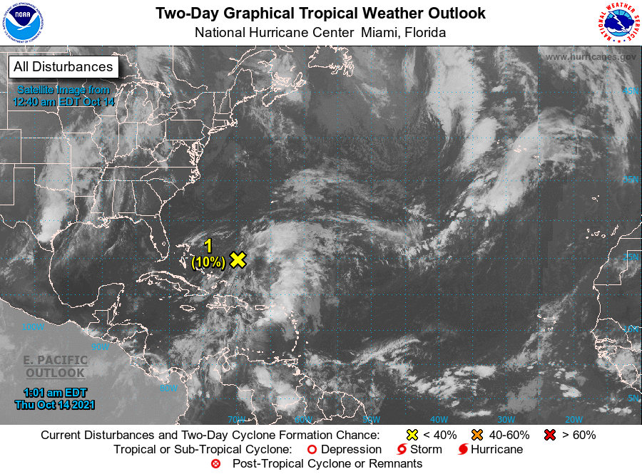 It is expected to interact with a front by tomorrow, ending any chance of further development, forecasters said. It has been given a 10 percent chance of developing.