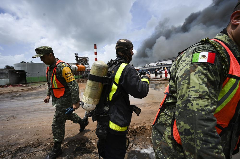 A Cuban firefighter stands between Mexican soldiers as they work to put out a deadly fire at a large oil storage facility in Matanzas, Cuba, Tuesday, August 9, 2022. The fire was triggered when lighting struck one of the facility’s eight tanks late Friday, Aug. 5th. (Yamil Lage, Pool photo via AP)