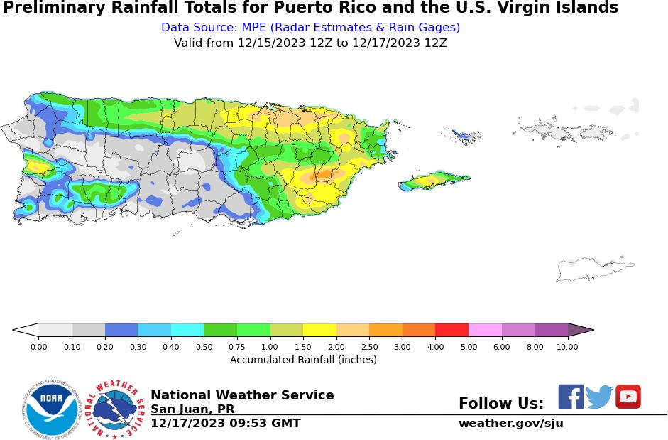 Frequent rains have already left between 1 and 2 inches of rain, with isolated amounts higher, over northern and eastern Puerto Rico. Riverstreams over northeast Puerto Rico are running high and additional rainfall could exacerbate their situation. So be careful along the rivers in this area, especially those close to the El Yunque area.