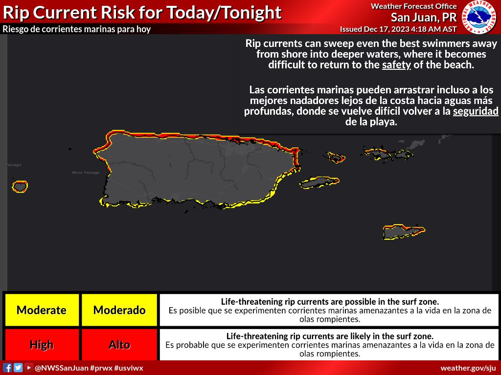 SAN JUAN — Rough and hazardous seas and life-threatening rip currents will continue through the next workweek. Expect northeast winds between 15-25 mph, with occasional wind gusts up to 30 mph across portions of the islands and regional waters through much of the workweek. Marine conditions could deteriorate further by the latter part of the week as a northerly swell arrives.