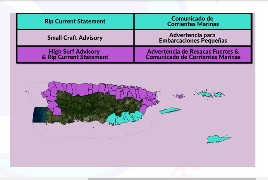 Surf Zone: Life-threatening swimming and rip current conditions due to large breaking waves of up to 10-13 feet. As a result, a High Surf Advisory is in effect until 6 PM this evening for the north-facing beaches of Puerto Rico. Furthermore, a High Rip Current Risk is also in place for these