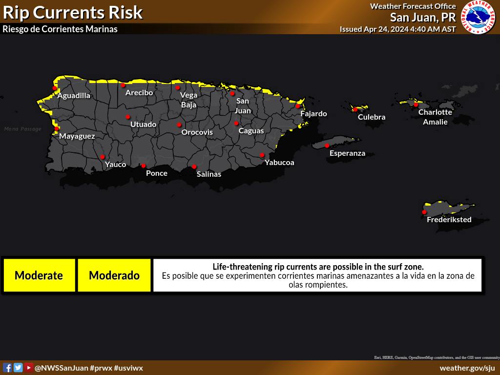Also, there is a low risk of rip currents today, increasing to moderate tonight across the northern beaches of the islands, the NWS said.