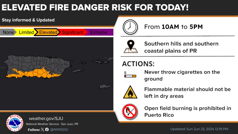 Additionally, there is an elevated fire danger risk for the southern hills and southern coastal plains of Puerto Rico between 10:00 a.m. and 5:00 p.m. today, according to the NWS.