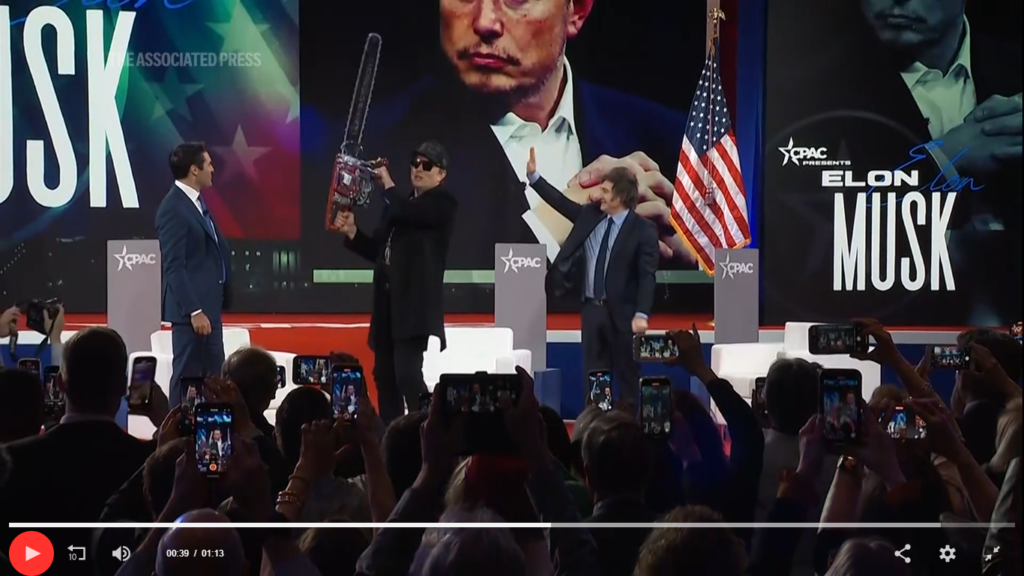 ELON AND THE MUSK-OVITES: Billionaire advisor Elon Musk appears on stage Thursday at the Conservative Political Action Conference in Maryland with a chainsaw given to him by Argentine President Javier Milei.