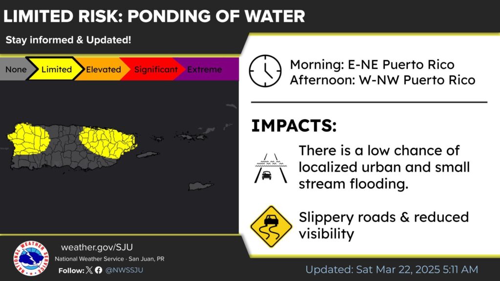 Limited flooding risk over the eastern and northeastern sections of Puerto Rico during the morning and the western and northwestern sections of Puerto Rico during the afternoon, according to the NWS.