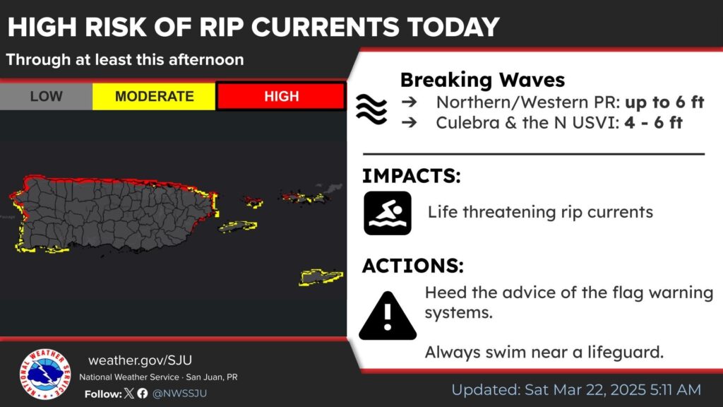 There is a high risk of life-threatening rip currents across north-oriented beaches of Puerto Rico, Culebra, St. Thomas, St. John and Water Island, the National Weather Service said.