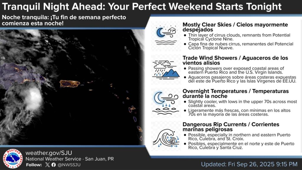 Meanwhile, there is a moderate risk of rip currents in St. Croix, Culebra and along the northern, northwestern, and eastern coasts of Puerto Rico, with a low risk for the rest of the coastal areas.