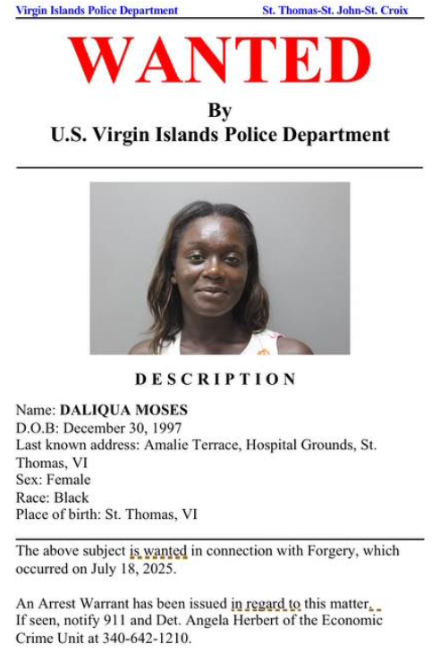 DALIQUA MOSES, 27, of Hospital Ground, is currently being sought by the Virgin Islands Police Department on a charge of forgery.