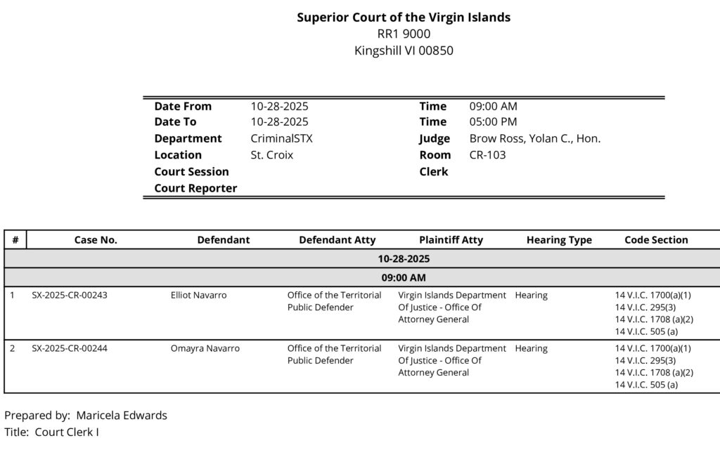 A case was filed against the Navarros at the Attorney General’s office, and an arrest warrant was signed on September 26, 2025, by a magistrate judge of the Superior Court of the Virgin Islands, according to police.