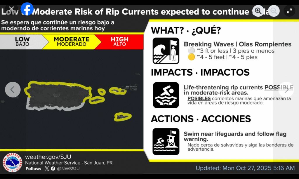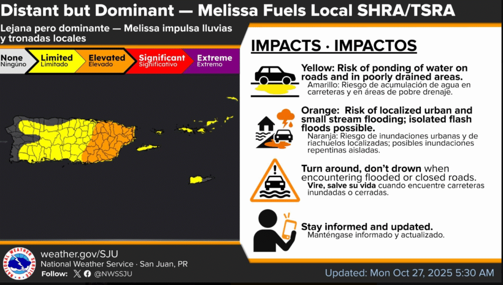 Humidity associated with the distant Melissa continues to affect the region, causing isolated rain and thunderstorms, mainly over the east, south and interior of Puerto Rico.