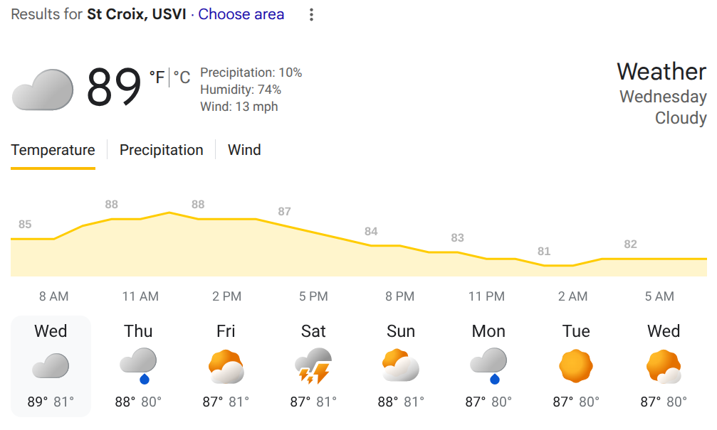 For St. Croix, breezy with a touch of rain this morning; otherwise, clouds yielding to some sun with a high of 91, AccuWeather said.