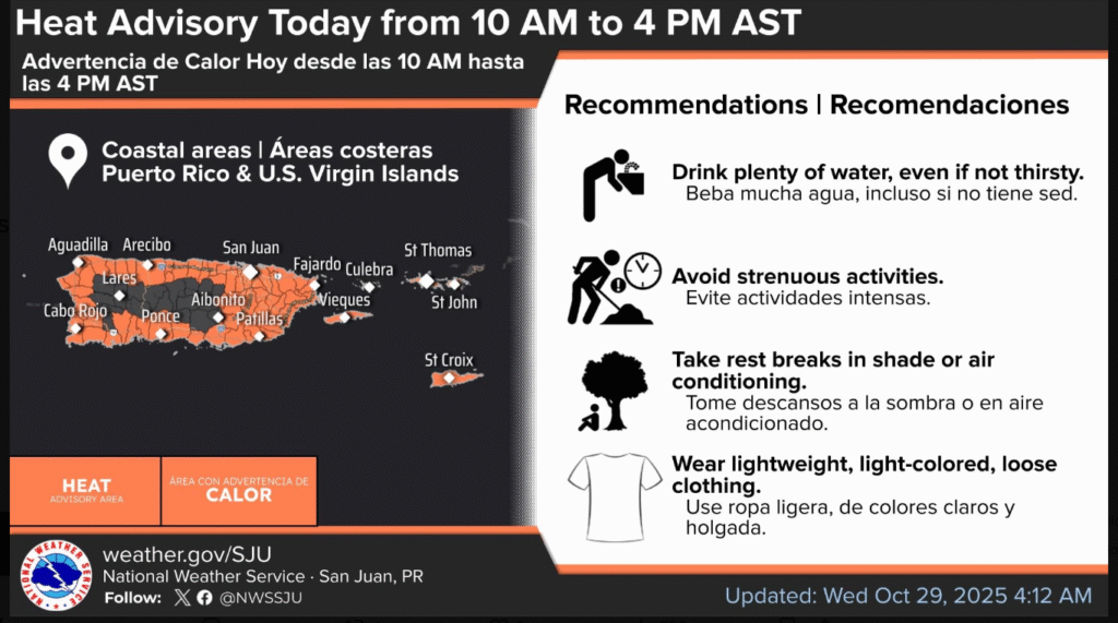 A Heat Advisory has been issued for the coastal and urban areas of the U.S. Virgin Islands and Puerto Rico from 10 AM to 4 PM AST.