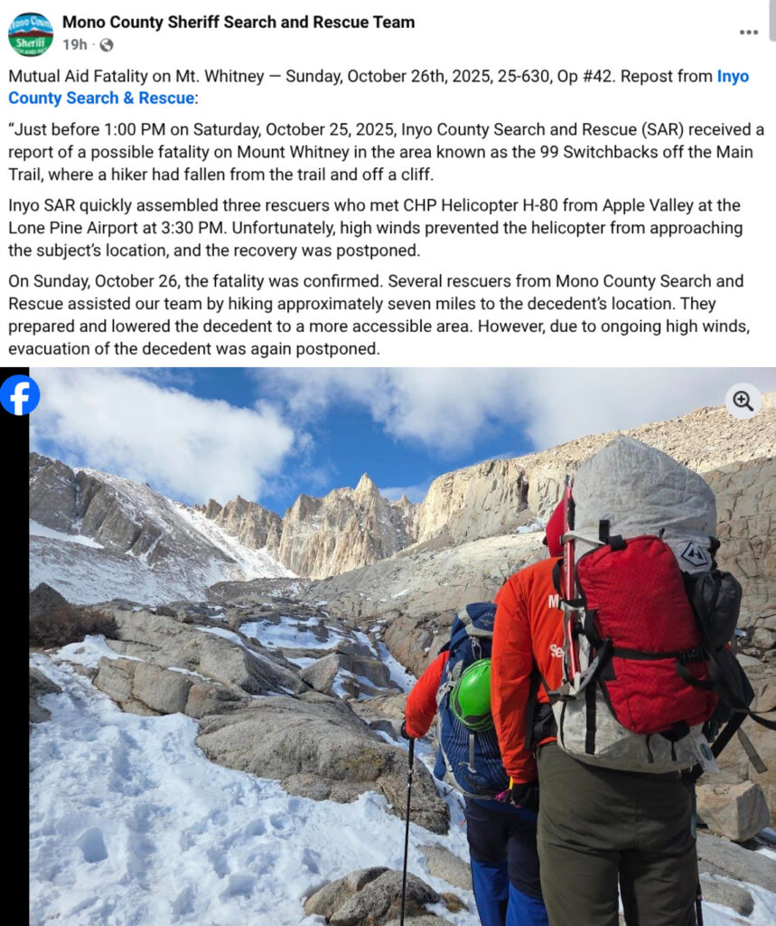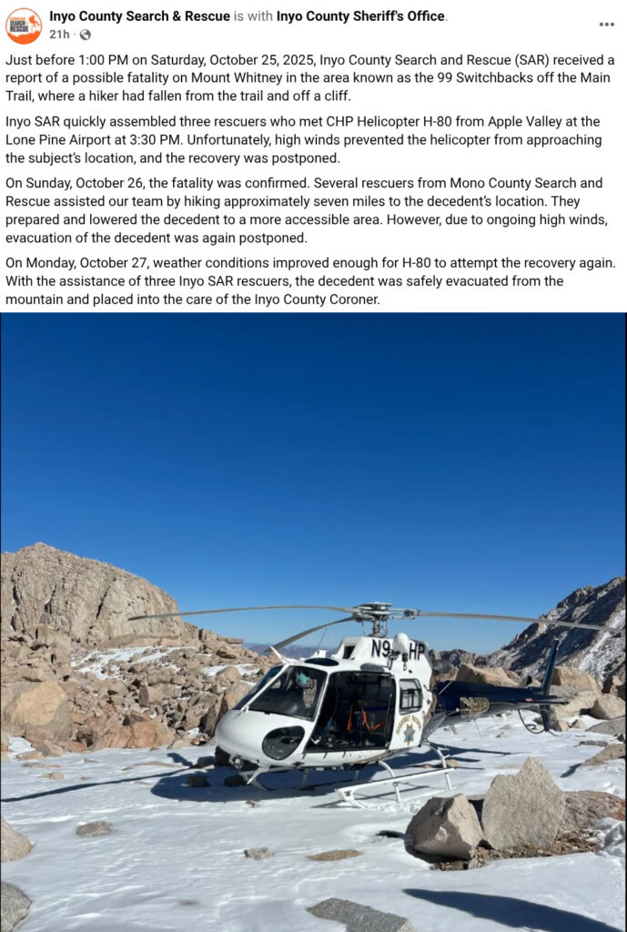 Inyo County Search and Rescue got a report of a possible death “on Mount Whitney in the area known as the 99 Switchbacks off the Main Trail” shortly before 1 p.m. Saturday, October 25, rescuers said in a Facebook post.