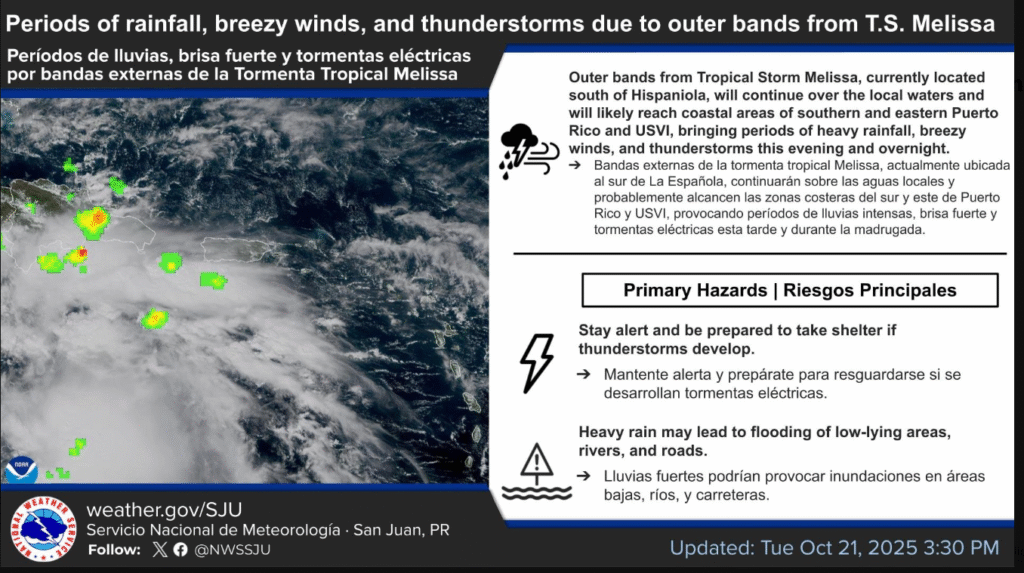 Outer bands from Tropical Storm Melissa, currently located about 300 miles south-southwest of Port-au-Prince, Haiti, the National Weather Service said.