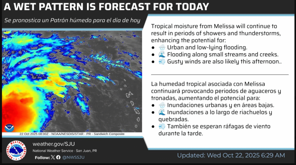 Rain Potential: According to the National Hurricane Center (NHC), between 2 and 4 inches of rain are expected through the end of the work week, mainly associated with the remaining moisture and the outer bands of Tropical Storm Melissa.