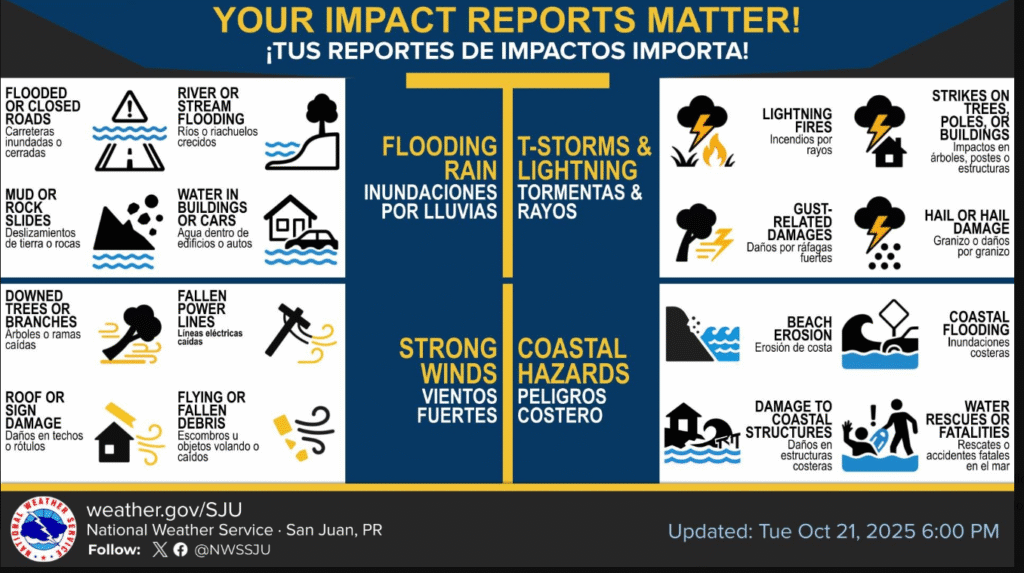Report flooding, damage, or rescues — safely — to @NWSSJU or call 9-1-1 if in danger.