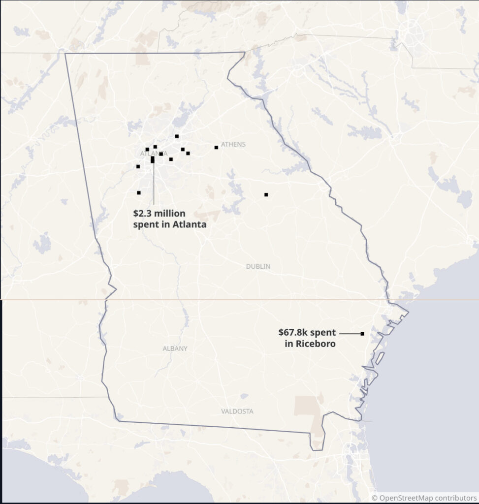 This map uses invoices paid by the Jackson Health Foundation to give a general idea of where Georgia vendors were located.