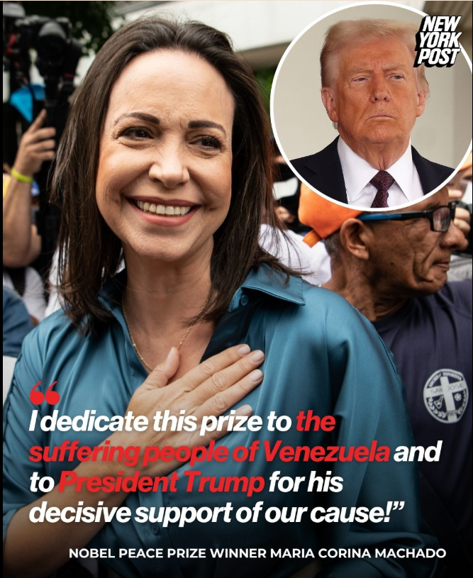 She later said, in an X post in English: “I dedicate the prize to the suffering people of Venezuela and to President Trump for his decisive support of our cause!”
