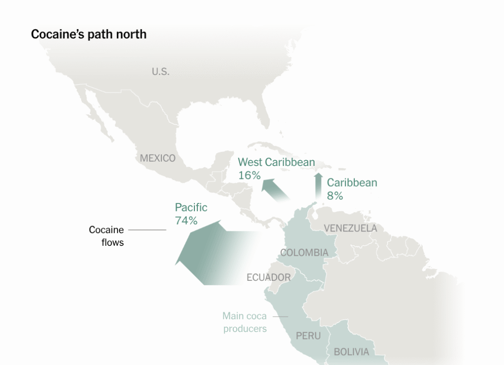 Three countries in South America produce most of the world’s cocaine. The majority of the cocaine that is smuggled to the United States moves through the Pacific, not the Caribbean, U.S. data shows.