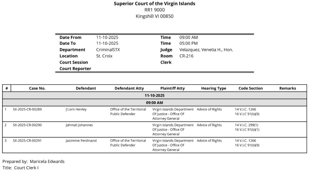 Henley was scheduled to appear for an advice-of-rights hearing at the Superior Court in Estate Kingshill this morning.