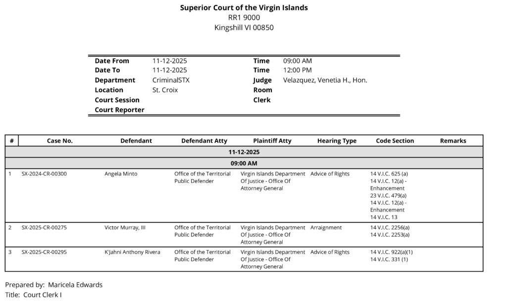 Hendrickson was scheduled for an advice-of-rights hearing in Superior Court at Estate Kingshill.
