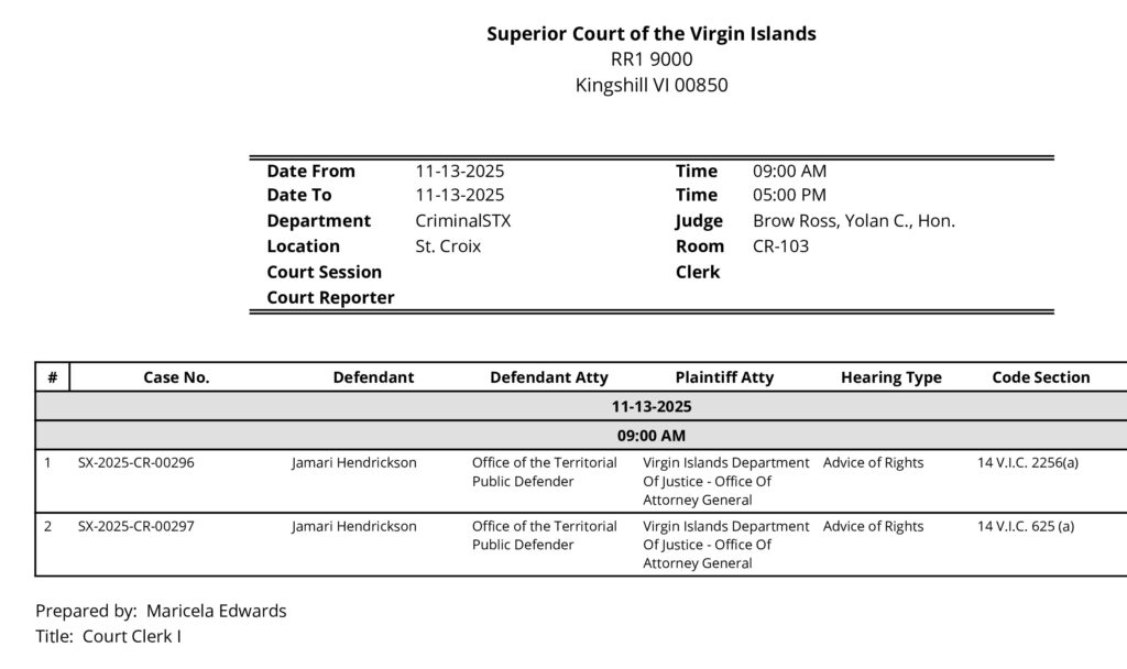 Hendrickson is scheduled for an advice-of-rights hearing in Superior Court at Estate Kingshill on Thursday.