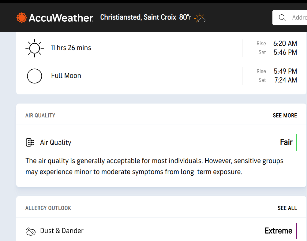 The extreme dust and dander levels on St. Croix today, November 5, 2025, are due to a plume of Saharan dust (also known as the Saharan Air Layer) that has moved across the Atlantic and enveloped the U.S. Virgin Islands region.