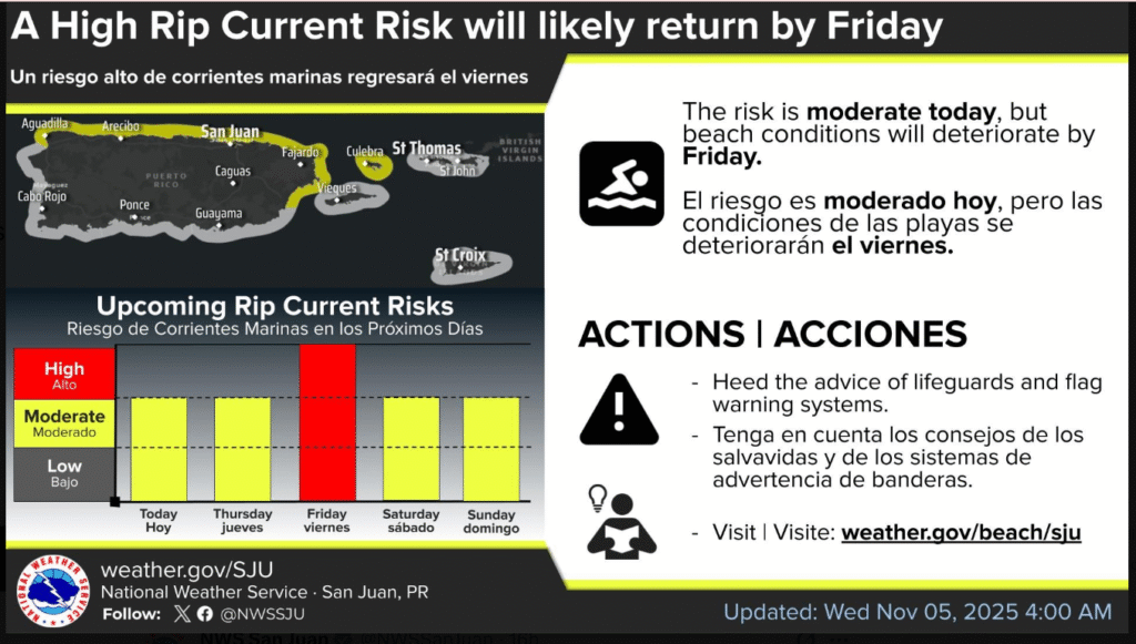 The risk of rip currents is low to moderate today, but beach conditions will deteriorate by Friday across north-exposed beaches, according to the NWS.