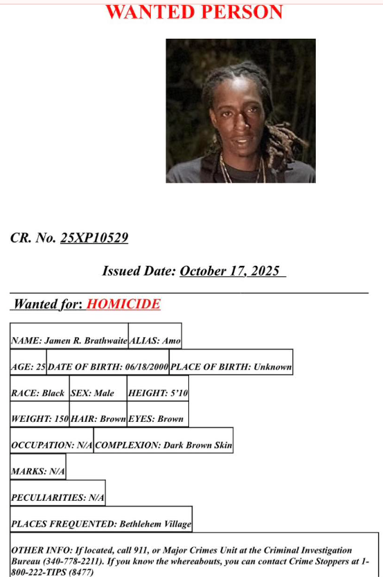 Jamen R. “Amo” Brathwaite, 25, of Bethlehem Village, is wanted in connection to a homicide, the Virgin Islands Police Department said.