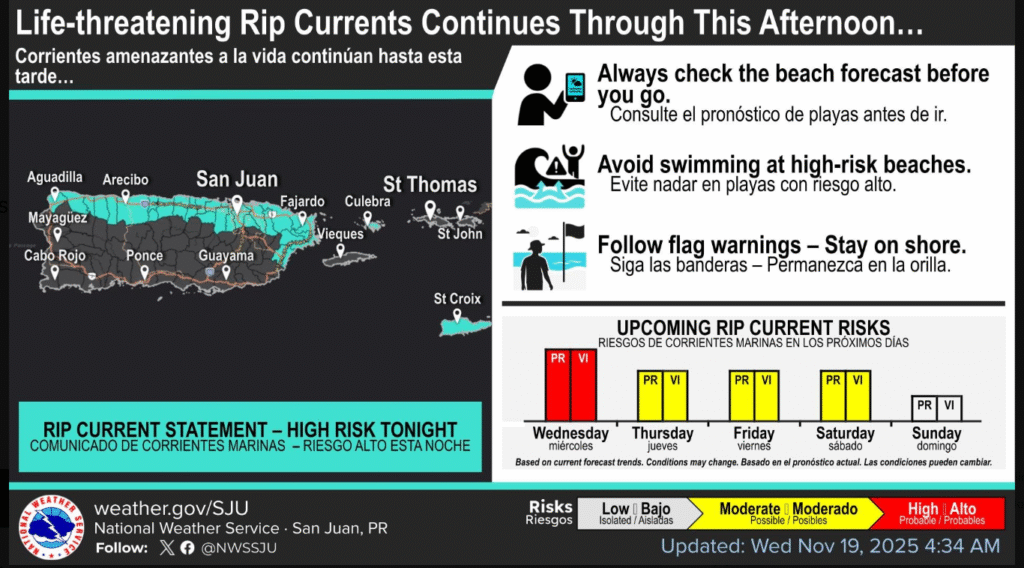 There is still a high risk of rip currents for St. Croix, Culebra and the northern and eastern beaches of Puerto Rico, Culebra, according to the NWS.