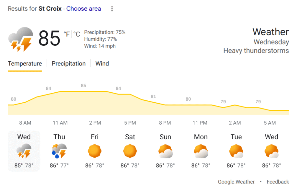 Tonight St. Croix can expect partly cloudy conditions with a couple of thunderstorms and a low of 75, AccuWeather said.