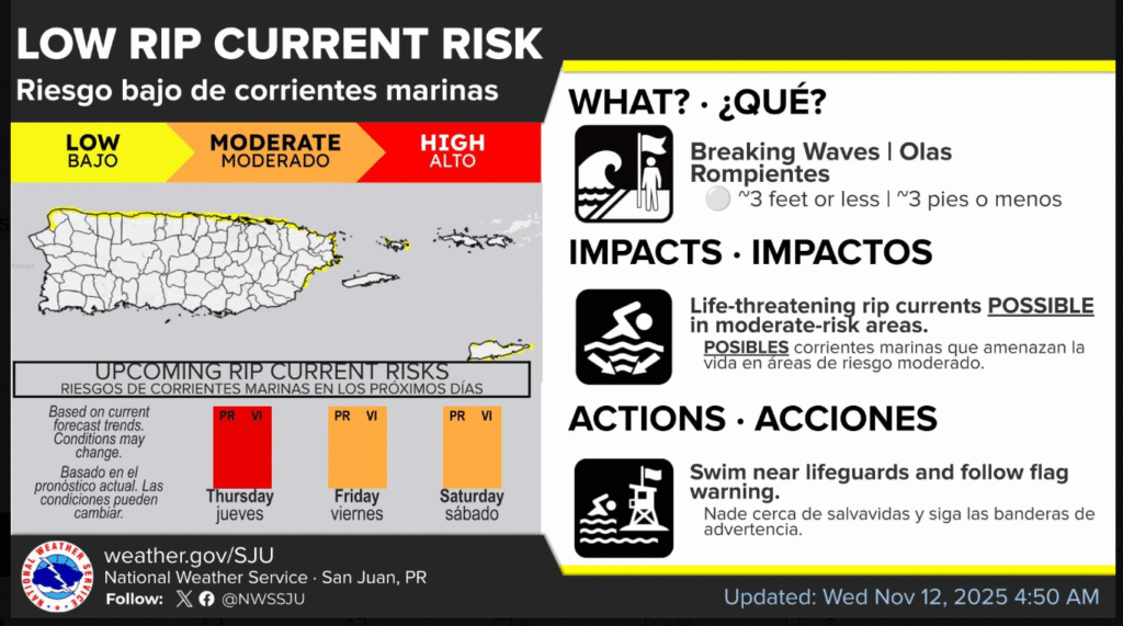 There is a low risk of rip current along the northern coastal areas of Puerto Rico, Culebra and St. Croix, the NWS said.