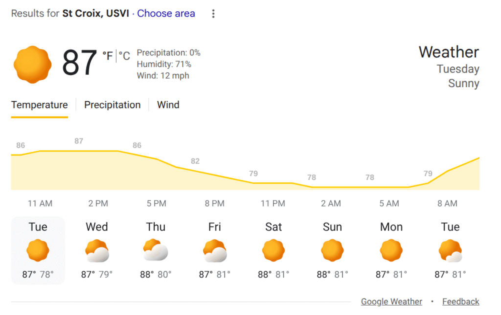Today St. Croix will be partly sunny with a shower in spots this morning, AccuWeather said. High 87.