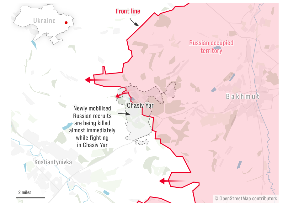 In further evidence of Russia’s costly tactics, a soldier fighting in Chasiv Yar said this week that newly mobilised recruits sent to the front often die almost immediately, with his own unit suffering over 90 per cent losses.