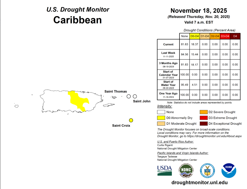 In the latest update from the Drought Monitor, some areas in the interior, southwest, and north-central parts of Puerto Rico and St. Croix in the U.S. Virgin Islands are already looking abnormally dry, the NWS said.