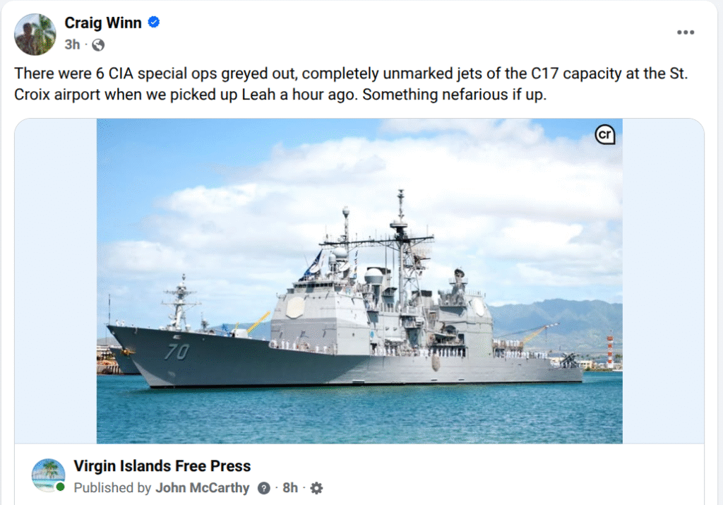 “There were six CIA special ops greyed out, completely unmarked jets of the C17 capacity at the St. Croix airport when we picked up Leah a hour ago,” Craig Winn said on Facebook. “Something nefarious is up.”