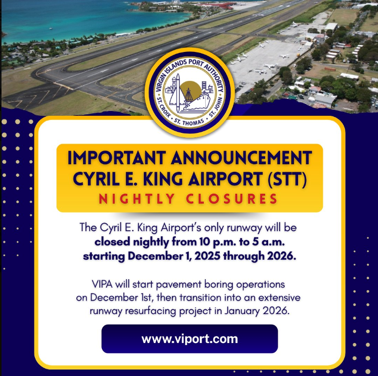 “Starting December 1, 2025, Cyril E. King Airport’s runway will close nightly from 10 p.m. to 5 a.m. for essential runway projects and upgrades, improving safety and efficiency,” VIPA said on X. “Work won’t disrupt normal operations.”