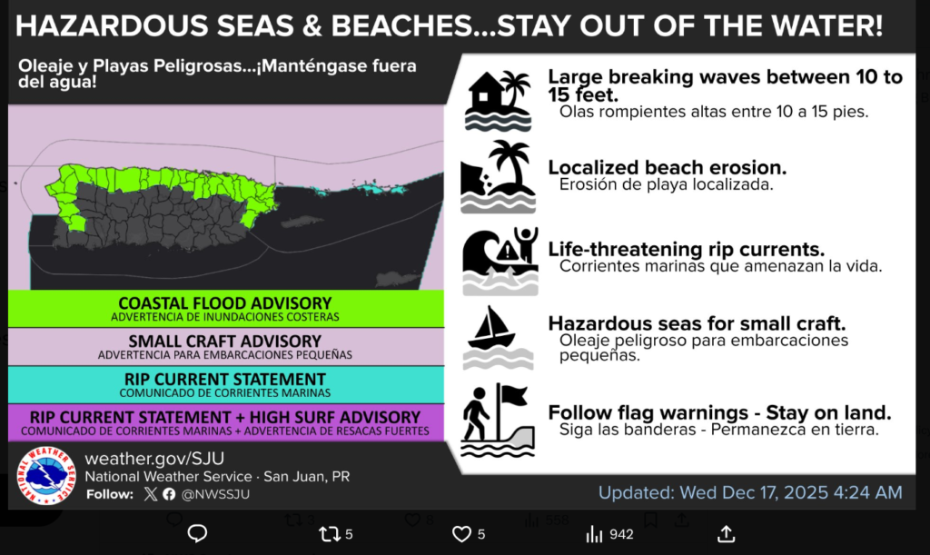 Therefore, a Coastal Flood Advisory, a High Surf Advisory, Small Craft Advisory and a High Rip Current Risk has been issued along the coastal and offshore Atlantic waters and Passages; and the exposed beaches of the islands through tomorrow morning, according to the NWS.