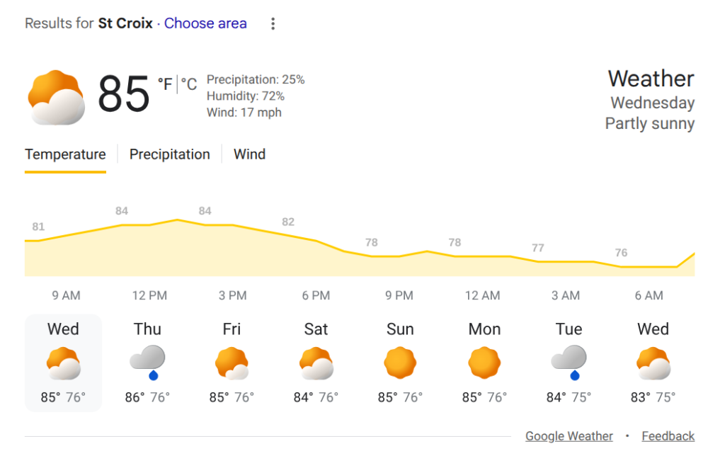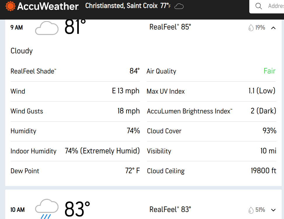 Tonight St. Croix will experience mainly clear conditions and a low of 74, according to AccuWeather.