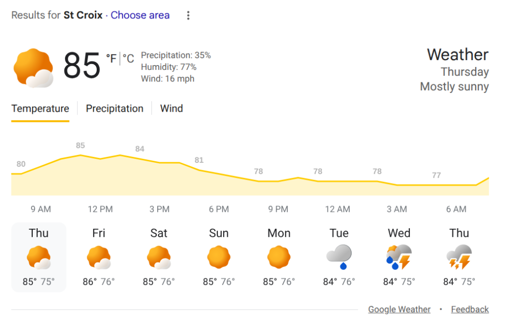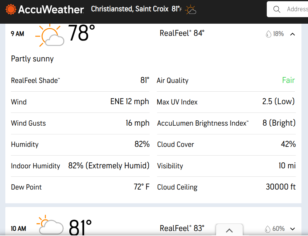Tonight St. Croix will experience partly cloudy conditions with a shower in places late. Low 76, AccuWeather.