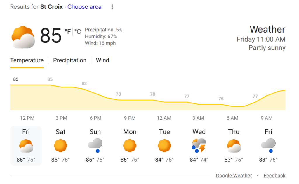 Tonight St. Croix will experience partly cloudy conditions and a low of 73, according to AccuWeather.