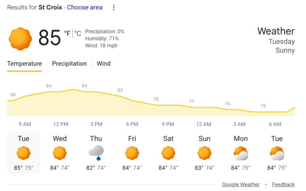 Today St. Croix will be breezy with sunshine and some clouds, high 86, AccuWeather said.