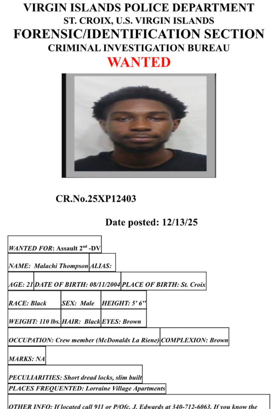 Malachi Thompson, 21, of Grove Place, is currently being sought by the Virgin Islands Police Department on a charge of second-degree assault.