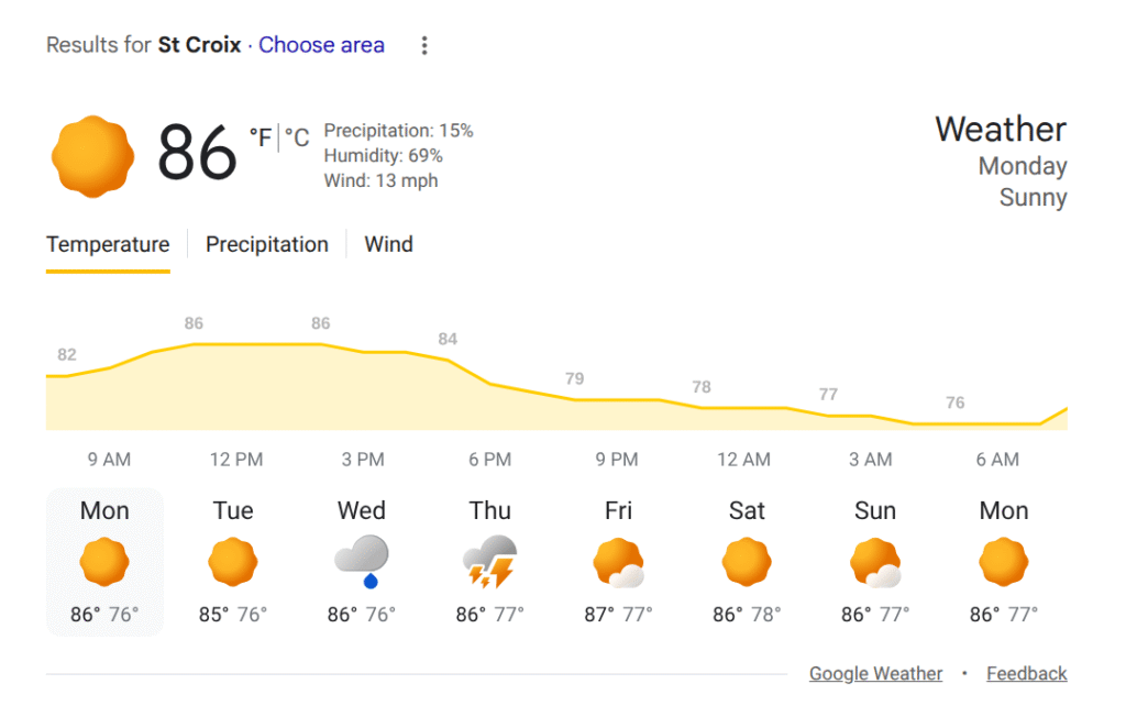 Today St. Croix will be partly sunny with a shower in our area this afternoon. High 88, AccuWeather said.