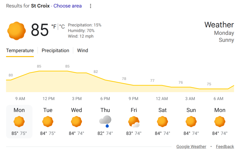 Tonight St. Croix will see clear to partly cloudy conditions and a low of 72, according to AccuWeather.