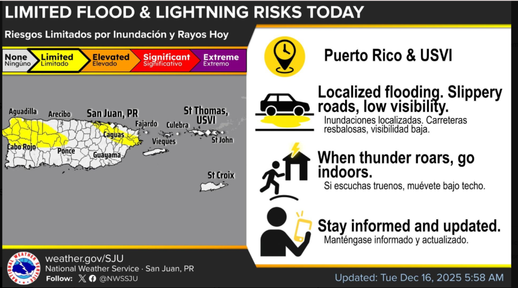 Limited flooding and lightning risks today for the U.S. Virgin Islands and Puerto Rico